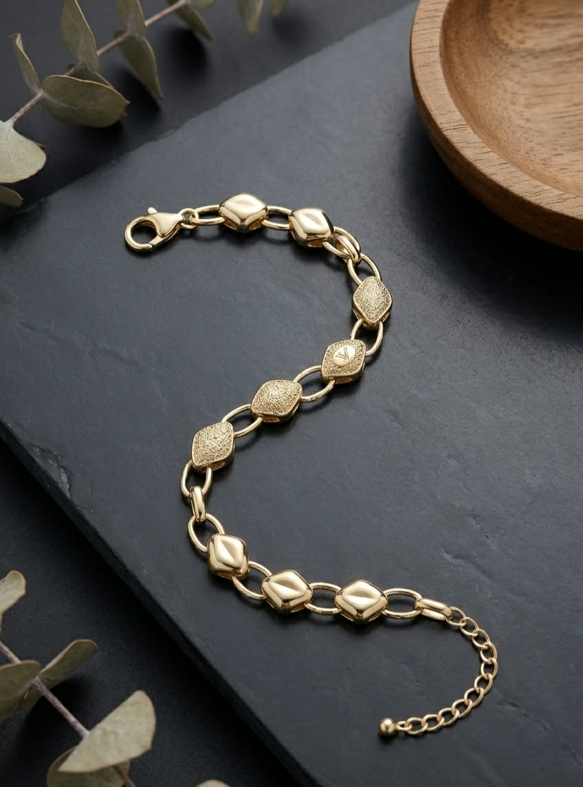 Adaugă o notă de lux încheieturii tale cu această brățară aurie superbă. Designul cu elemente texturate captează lumina discret, oferind un aspect sofisticat.