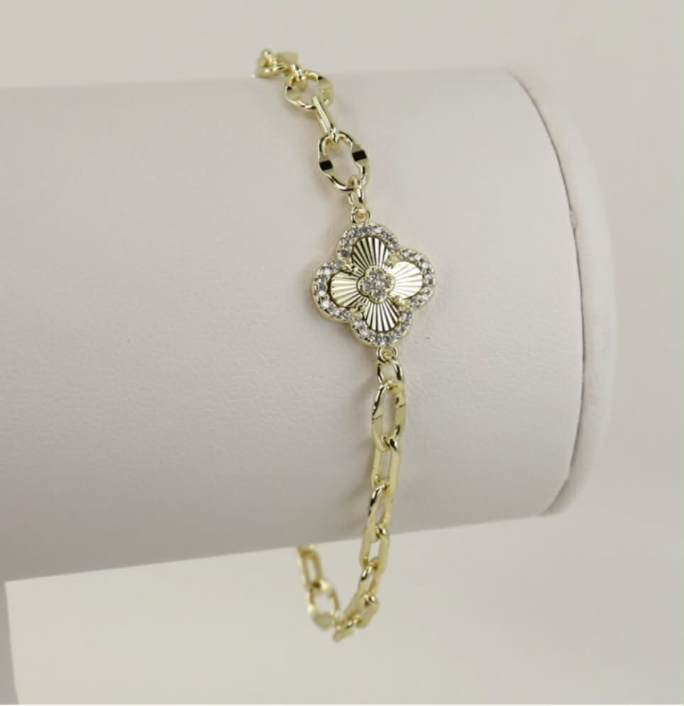 Adaugă o notă de sofisticare stilului tău cu această brățară deosebită, realizată cu un lanț elegant de tip zale. Piesa centrală este un pandantiv în formă de trifoi cu patru foi, simbol al norocului, finisaj texturat, radiant în interior.