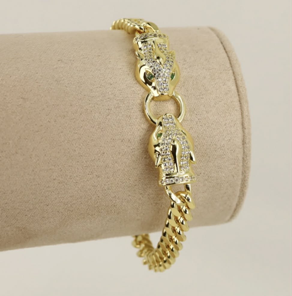 Adaugă o notă de rafinament și putere ținutei tale cu această brățară deosebită, ce îmbină designul clasic Cuban Link cu simbolul eleganței sălbatice: pantera