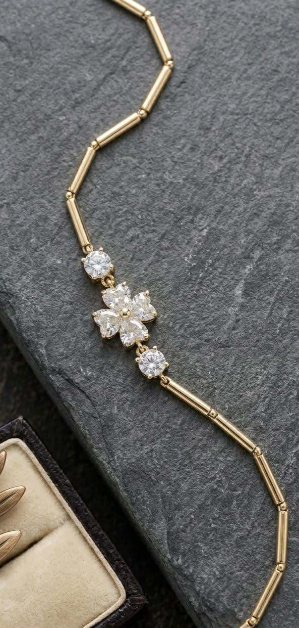 Adaugă o notă de rafinament și strălucire ținutei tale cu această brățară deosebită, ce îmbină designul clasic cu detalii moderne. Piesa centrală este un pandantiv delicat în formă de floare