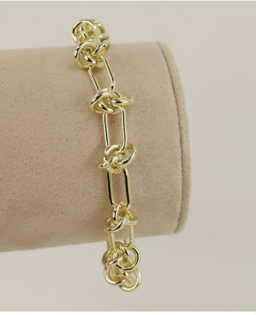 Descoperă o bijuterie care nu este doar un accesoriu, ci o declarație de stil. Această brățară cu zale alungite și noduri împletite manual emană forță și eleganță în același timp. Finisajul auriu impecabil reflectă lumina la fiecare mișcare, fiind piesa ideală pentru a completa o ținută office sau o rochie de seară minimalistă. Un cadou memorabil pentru tine sau pentru cineva drag.”