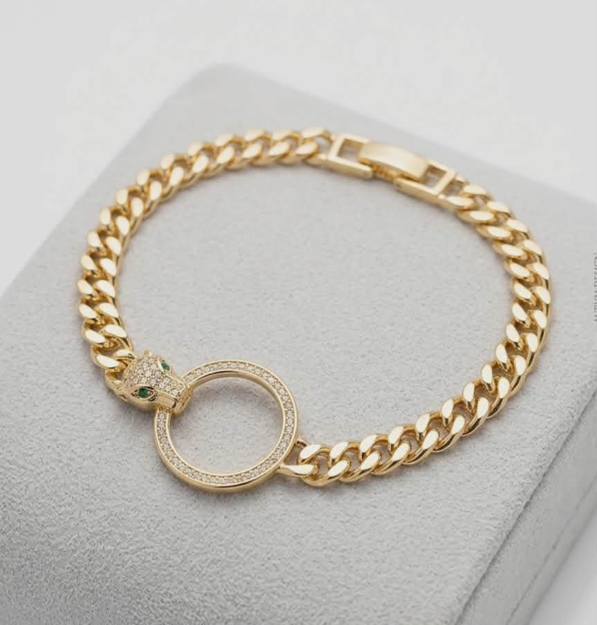 Adaugă o notă de lux garderobei tale cu această brățară spectaculoasă! Un design clasic tip lanț (curb chain), reinventat cu un element central fascinant: un cap de panteră decorat cu cristale strălucitoare și ochi verzi smarald, care susține un inel pavat cu pietre fine.