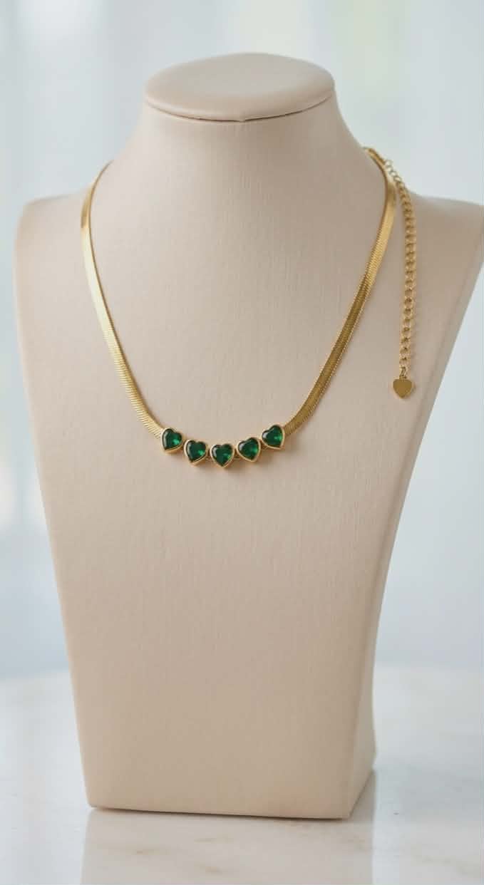 Adaugă o notă de rafinament ținutelor tale cu acest colier superb tip snake. Cele 5 inimi verzi vibrante simbolizează echilibrul și prospețimea, transformând orice look simplu într-unul sofisticat. Este accesoriul perfect pentru o seară specială sau un cadou memorabil pentru cineva drag