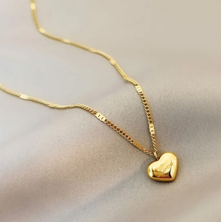 Adaugă o notă de rafinament ținutelor tale zilnice cu acest colier delicat, placat cu aur. Pandantivul în formă de inimă plină, gravat discret cu mesajul „Love”, simbolizează afecțiunea și eleganța atemporală.