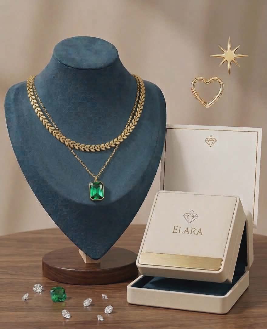 Descoperă eleganța atemporală cu noul colier dublu Elara. Combinația dintre strălucirea aurie a lanțului model spic și profunzimea pietrei verzi smarald creează un contrast magnetic, perfect pentru momentele în care vrei să strălucești.