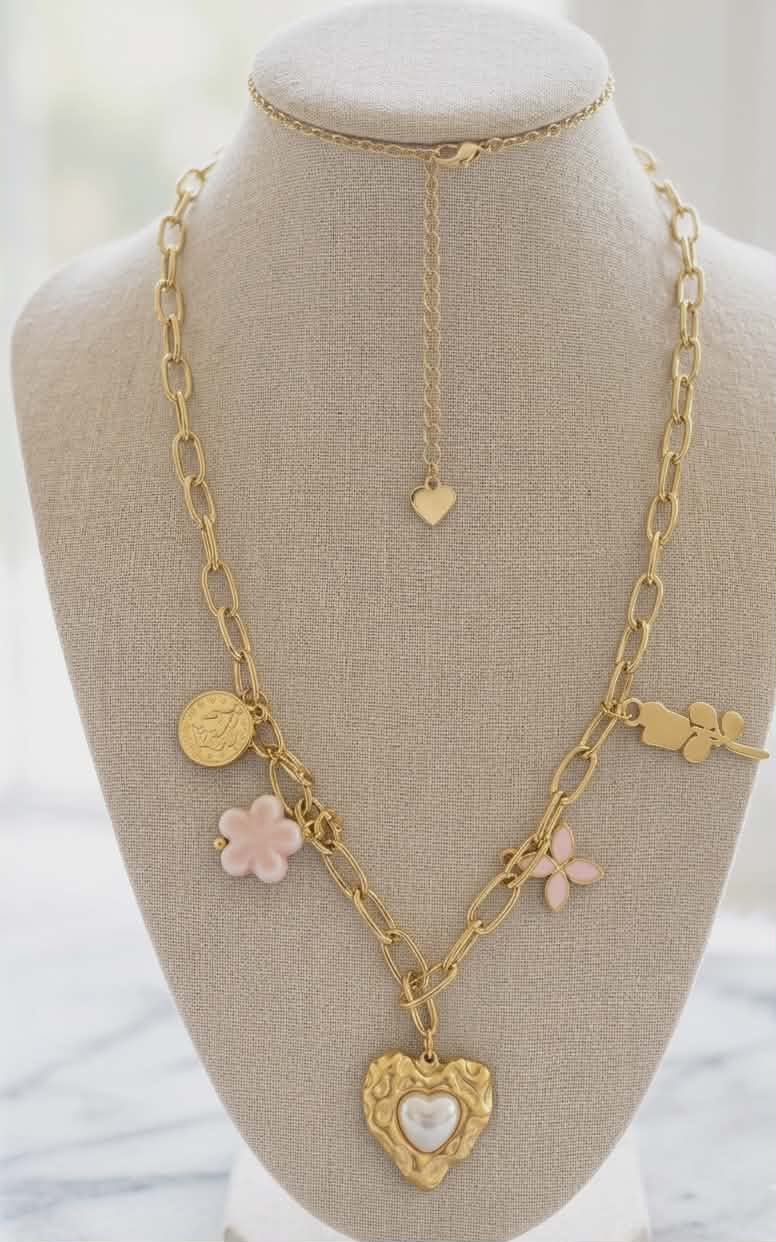 Adaugă o notă de rafinament ținutei tale cu acest colier unic! Piesa centrală este o inimă aurie texturată, decorată cu o perlă delicată, completată de talismane feminine: flori pastelate, o monedă clasică și un trifoi norocos. Designul cu zale mari (link chain) oferă un aer modern, fiind accesoriul perfect pentru orice ocazie.