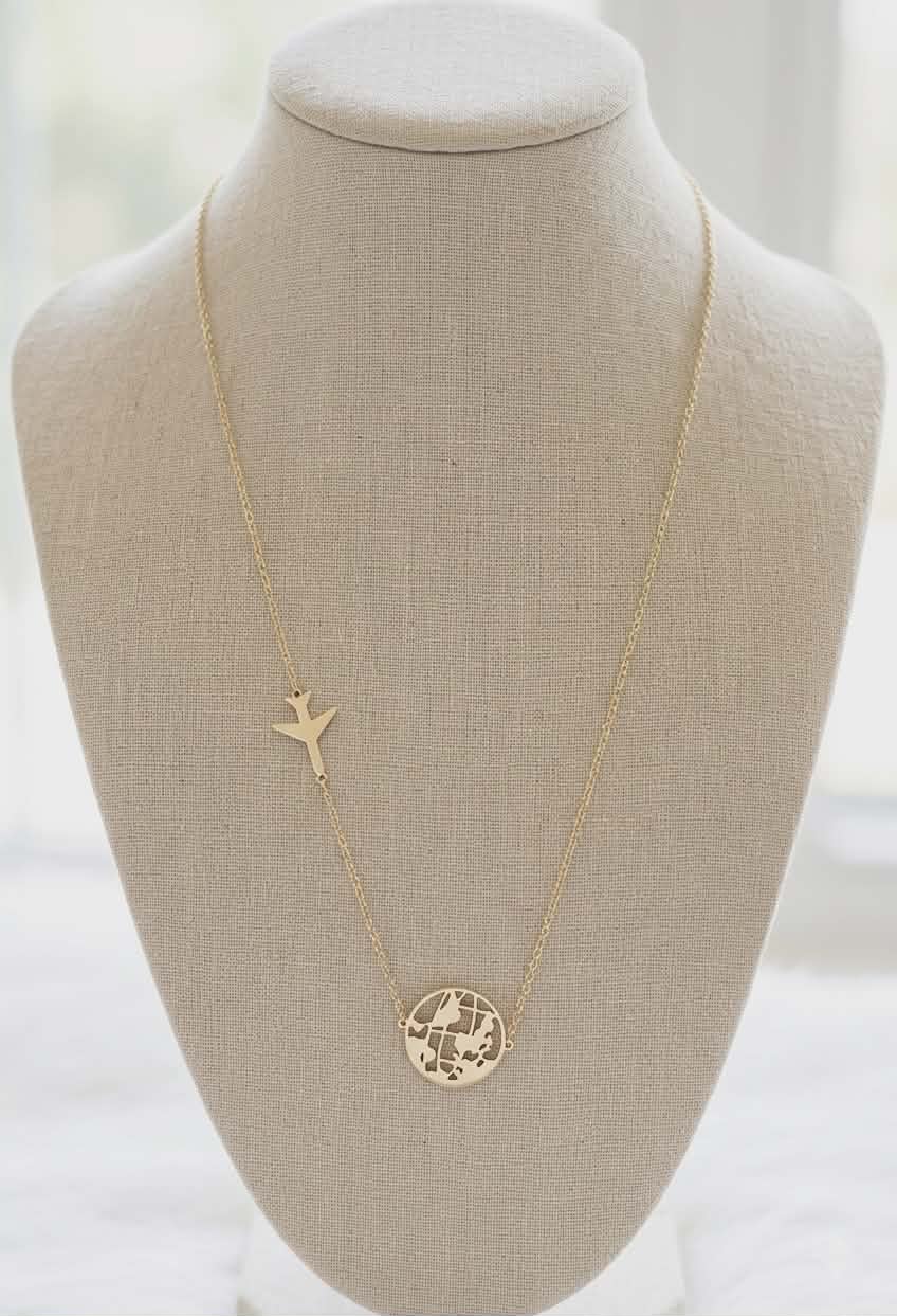 Poartă cu tine pasiunea pentru aventură! Acest colier delicat, cu un design modern și minimalist, este accesoriul ideal pentru orice iubitoare de călătorii. Pandantivul central în formă de glob pământesc, completat de detaliul jucăuș al unui avion în zbor pe lanț, transformă această bijuterie într-un simbol al libertății și al viselor fără frontiere.