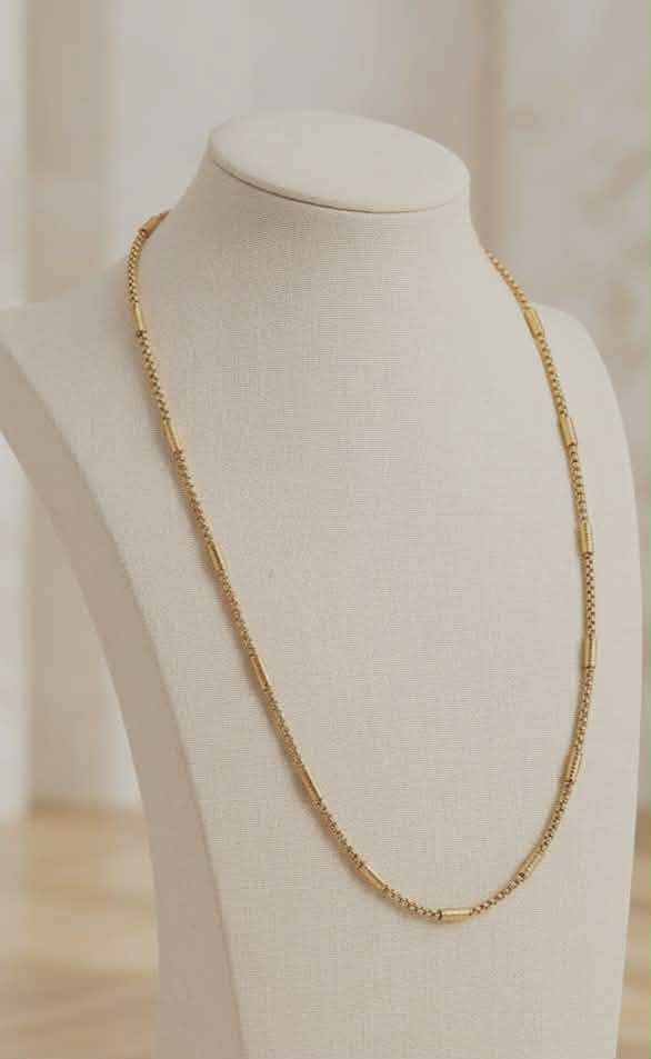 Adaugă o notă de rafinament garderobei tale cu acest lanț deosebit, ce îmbină designul clasic al zalelor fine cu accente moderne sub formă de segmente tubulare netede. Structura sa aerisită și strălucirea caldă îl fac accesoriul perfect atât pentru ținutele office, cât și pentru evenimentele de seară.