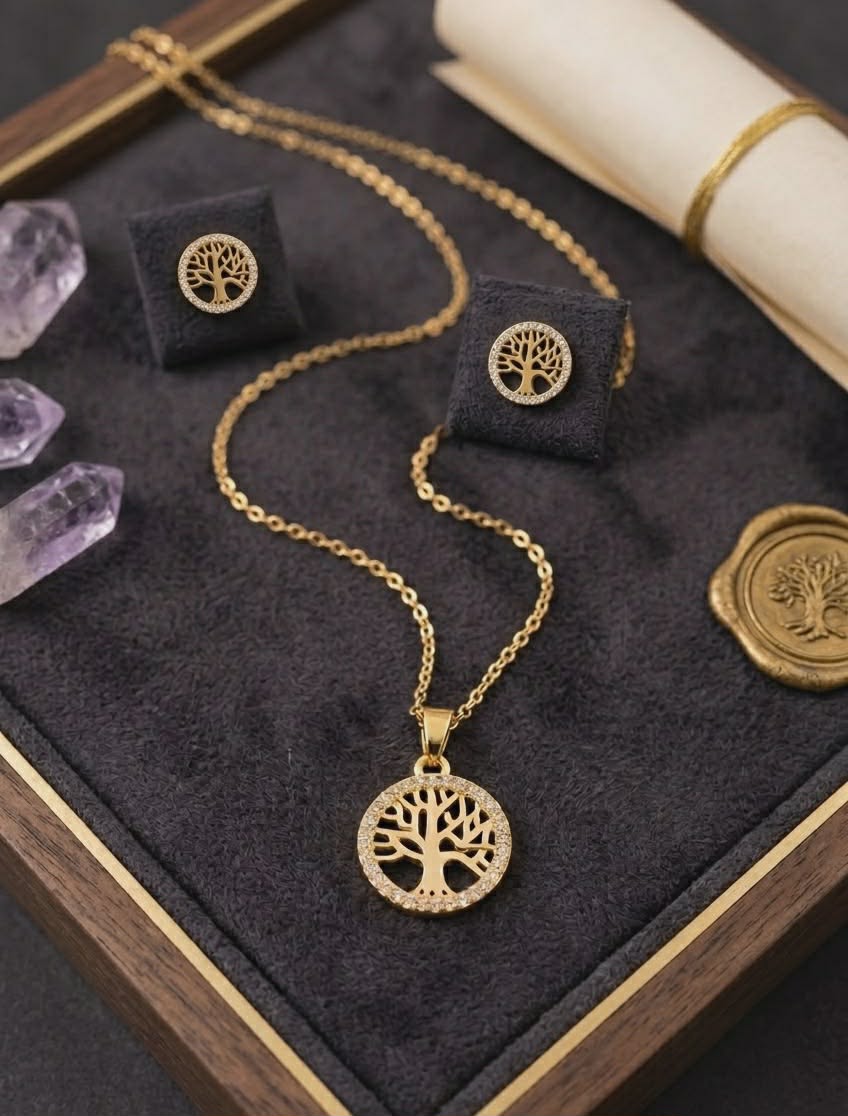 Adaugă o notă de rafinament și semnificație ținutelor tale cu acest set deosebit, format din colier și cercei asortați. Inspirat de simbolul universal al forței, echilibrului și evoluției, acest set este mai mult decât un accesoriu – este o declarație de stil.