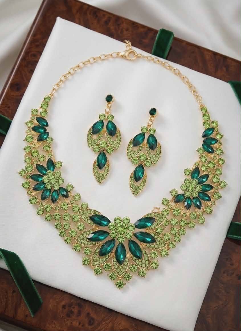 Adaugă o notă de regalitate ținutei tale cu acest set spectaculos, format din colier și cercei asortați. Designul floral elaborat, îmbogățit cu cristale verzi vibrante și strasuri strălucitoare, este creat pentru a capta toate privirile la evenimentele speciale.
