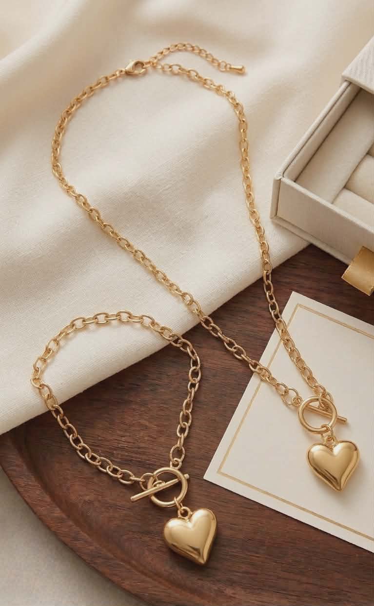 Acest set de bijuterii, compus dintr-un colier și o brățară asortată, impresionează prin designul său modern și elegant, fiind ideal pentru a adăuga o notă de rafinament oricărei ținute.