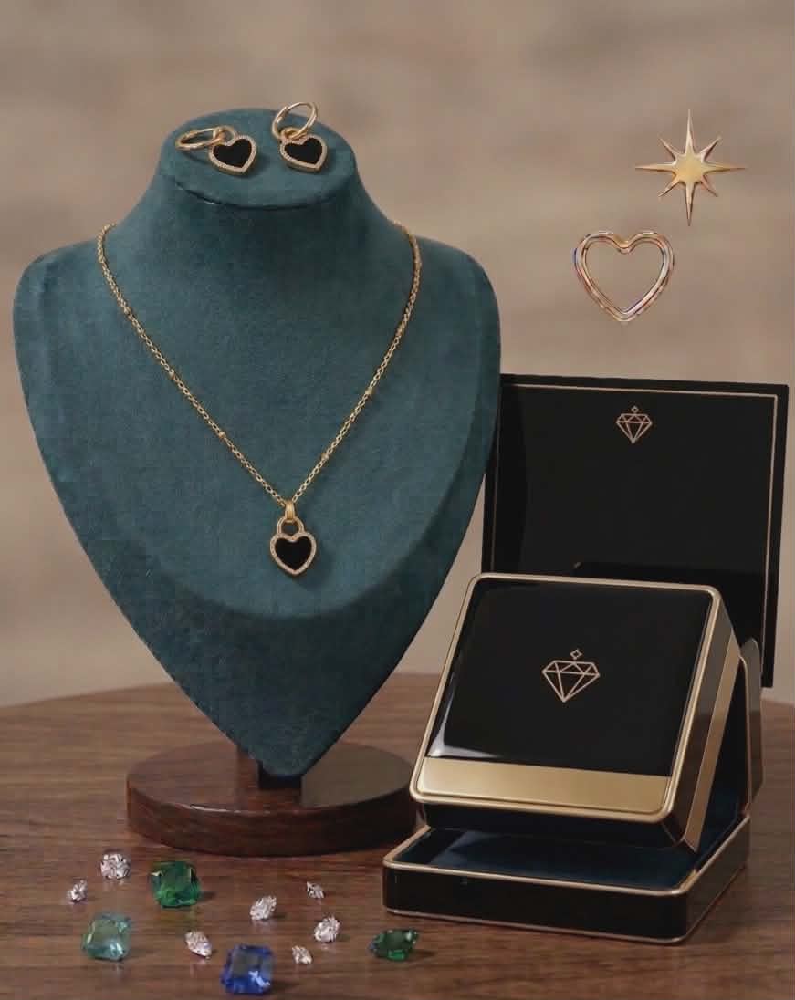 Eleganța se întâlnește cu misterul în acest set irezistibil. Creat pentru a completa orice ținută – de la o cafea cu prietenele până la o cină romantică – setul cu inimă neagră și detalii aurii este piesa de rezistență de care ai nevoie.