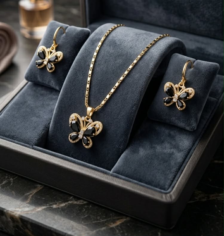 Adaugă o notă de mister și rafinament ținutei tale cu acest set deosebit, inspirat de delicatețea fluturilor. Setul este compus dintr-un colier fin și o pereche de cercei asortați, fiind accesoriul perfect pentru evenimente speciale sau pentru a eleva o ținută office elegantă