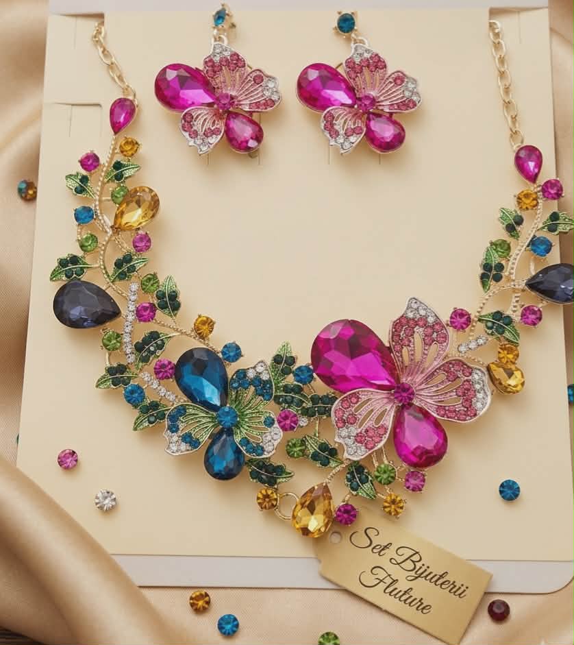 Adaugă o notă de magie și rafinament ținutei tale cu acest set spectaculos! Format dintr-un colier statement și cercei asortați, setul impresionează prin designul floral detaliat și cristalele vibrante în nuanțe de fucsia, albastru regal și chihlimbar.